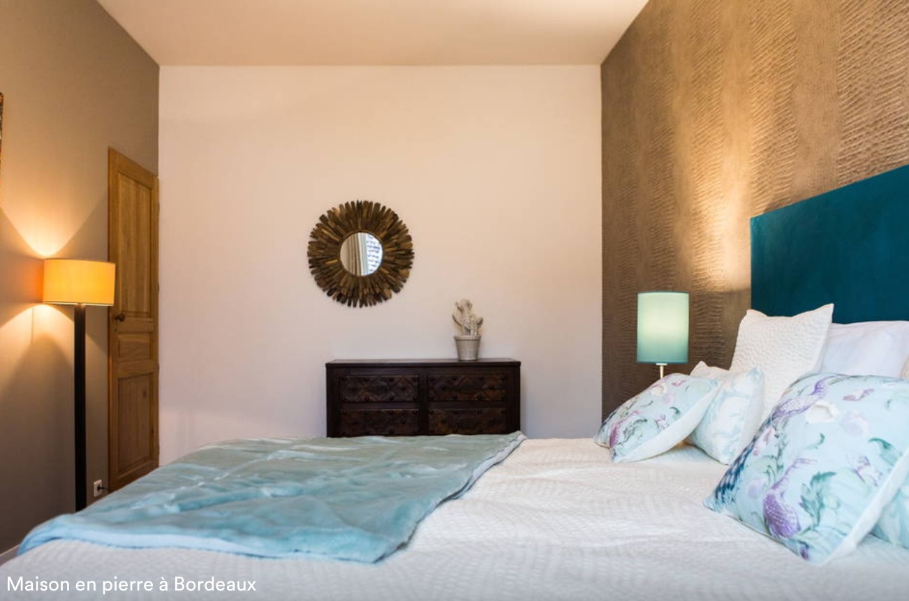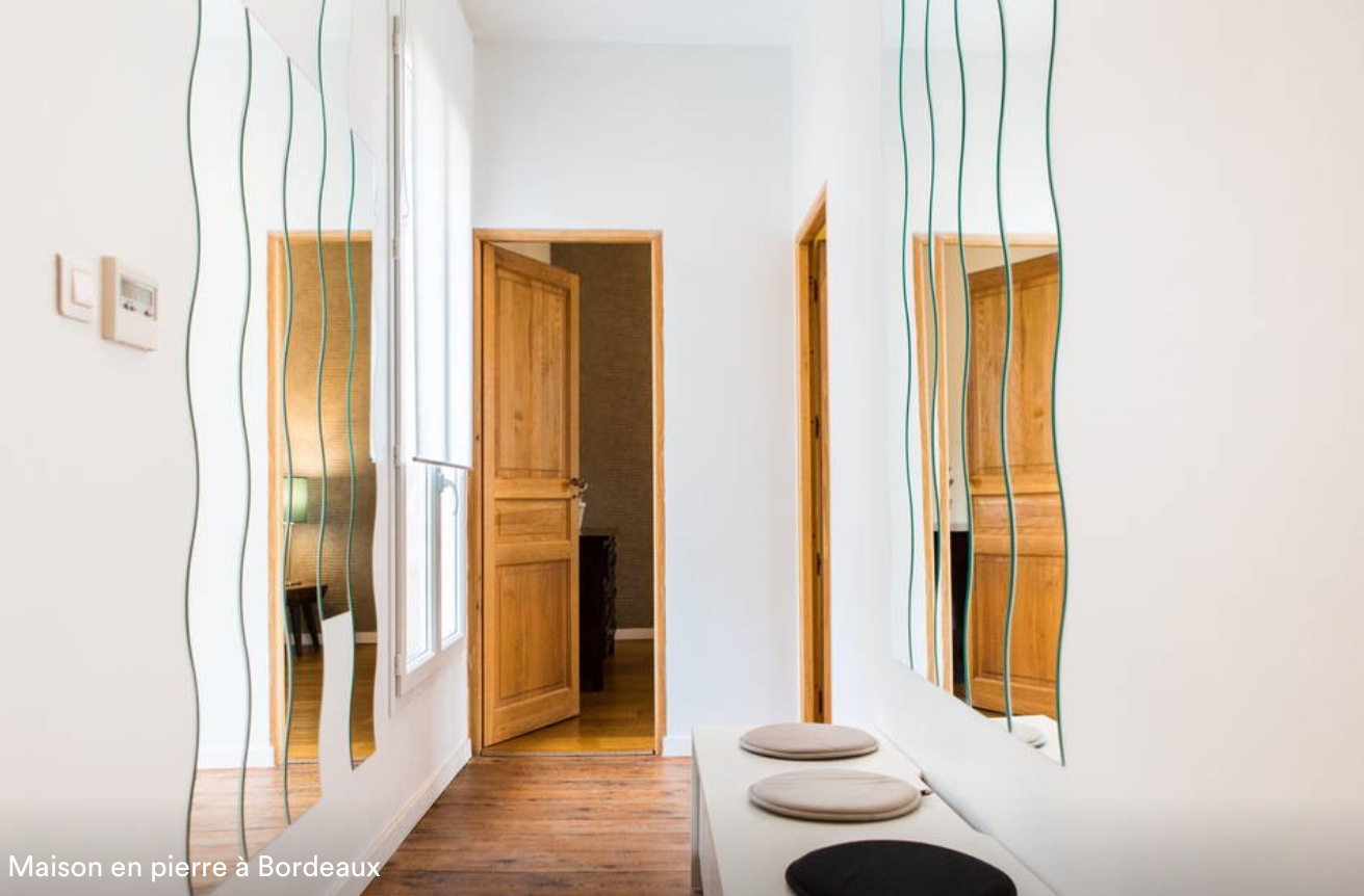 La petite maison (l’étage) En haut de l’escalier Chambre n°1 : un mur tapissé avec un papier pailleté jaune Chambre n°2 : Peau de serpent au mur et tête de lit en velours Paillettes sur l’autre mur Le couloir menant aux chambres